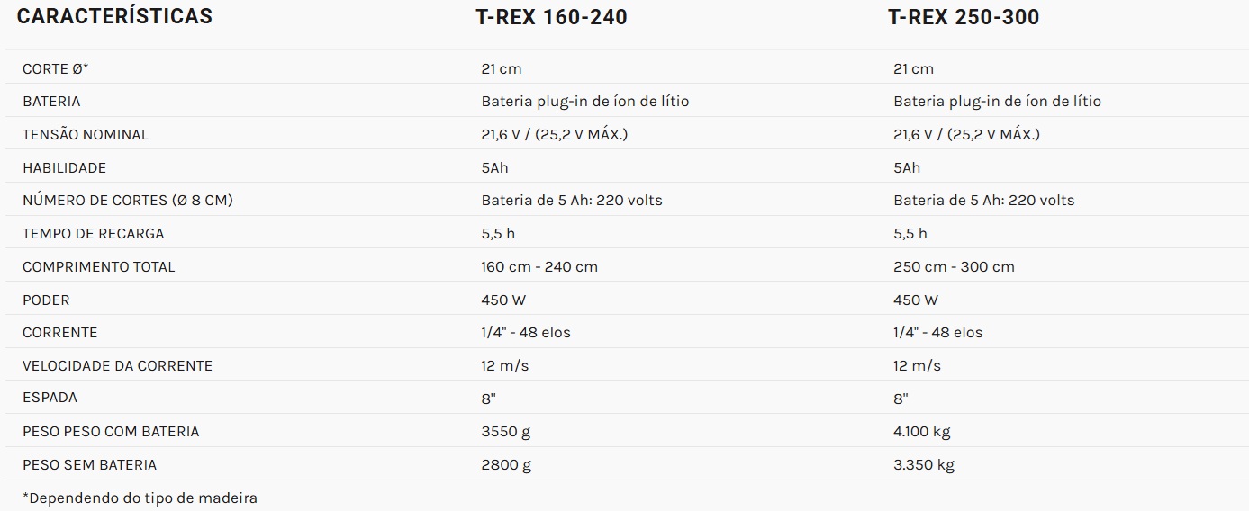 A T-REX 250-300 consegue cortar ramos com até 21 cm de diâmetro e funciona com uma bateria de íon-lítio com tensão nominal de 21,6 V (25,2 V máx.). A alta capacidade desta fonte de energia (5 Ah – 108 Wh) permite que a ferramenta realize até 220 cortes de ramos de 8 cm por carga.
