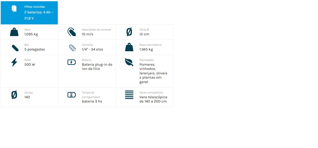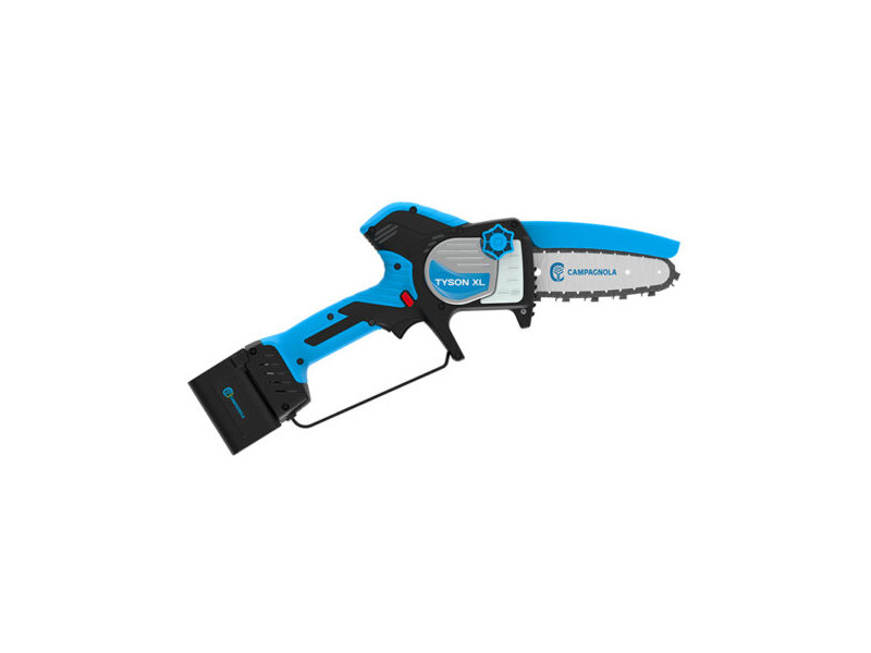 A roçadeira TYSON XL foi projetada para oferecer alto desempenho em um tamanho compacto. Seu motor sem escovas de 500 W e a barra de 5" com corrente de 1/4" (34 elos) atingem velocidades de até 10 m/s, garantindo cortes rápidos e precisos. A bateria de íon-lítio de 21,6 V - 4 Ah permite até 140 cortes em galhos de até 8 cm de diâmetro, enquanto o diâmetro de corte chega a 12 cm. A lubrificação automática mantém a corrente funcionando suavemente. Os recursos incluem velocidade variável, trava de segurança, proteção contra recuo com protetor de mão e indicador de status. Compatível com haste telescópica de 140 a 200 cm.
